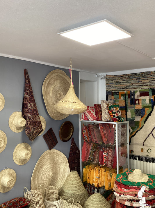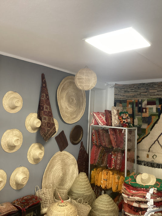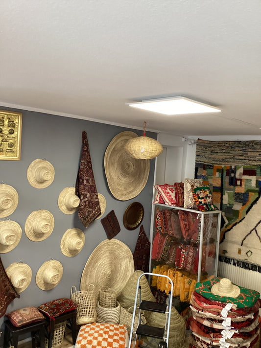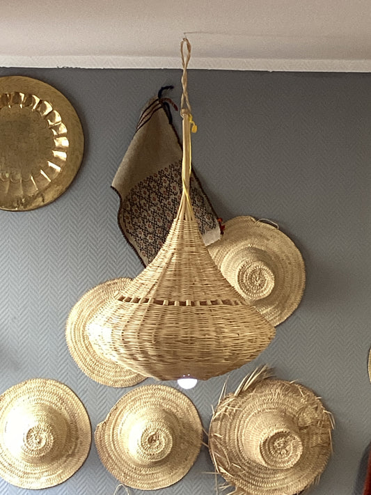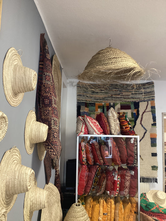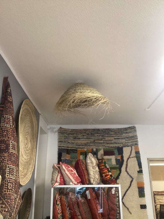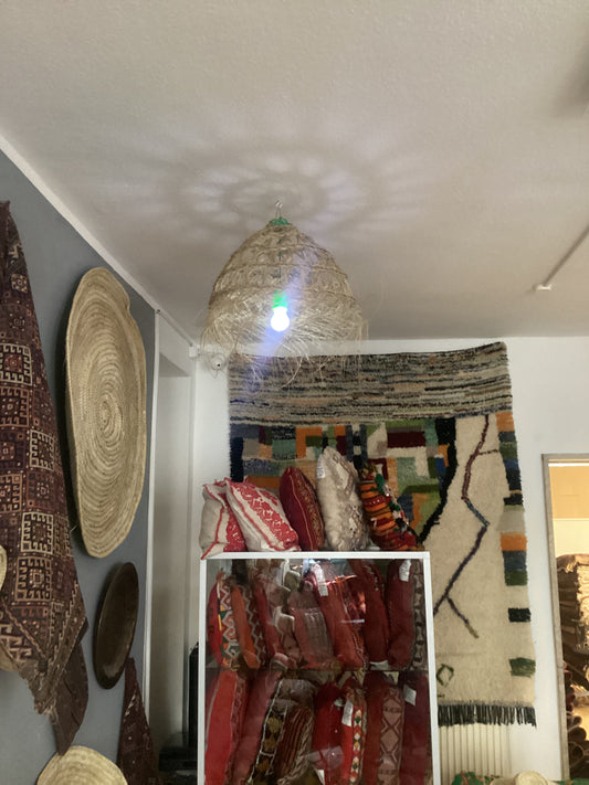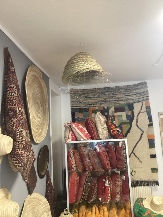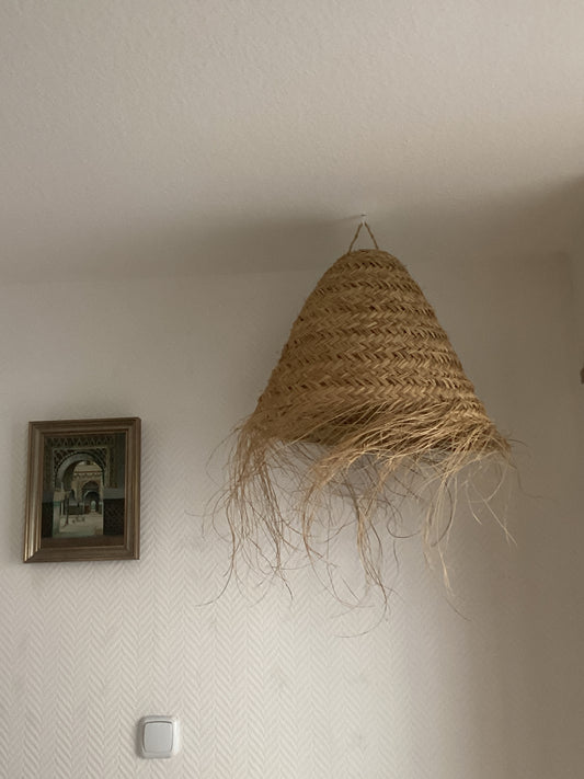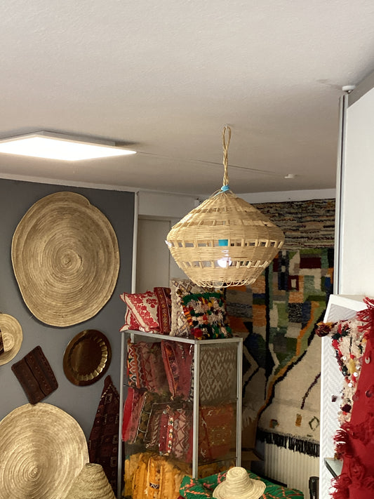 Traditionelle Rattanlampenschirme, von Hand geflochten in Marokko, verkörpern zeitlose Eleganz und handwerkliches Geschick. Jeder Schirm wird sorgfältig aus natürlichen Rattanfasern gefertigt.